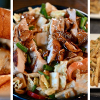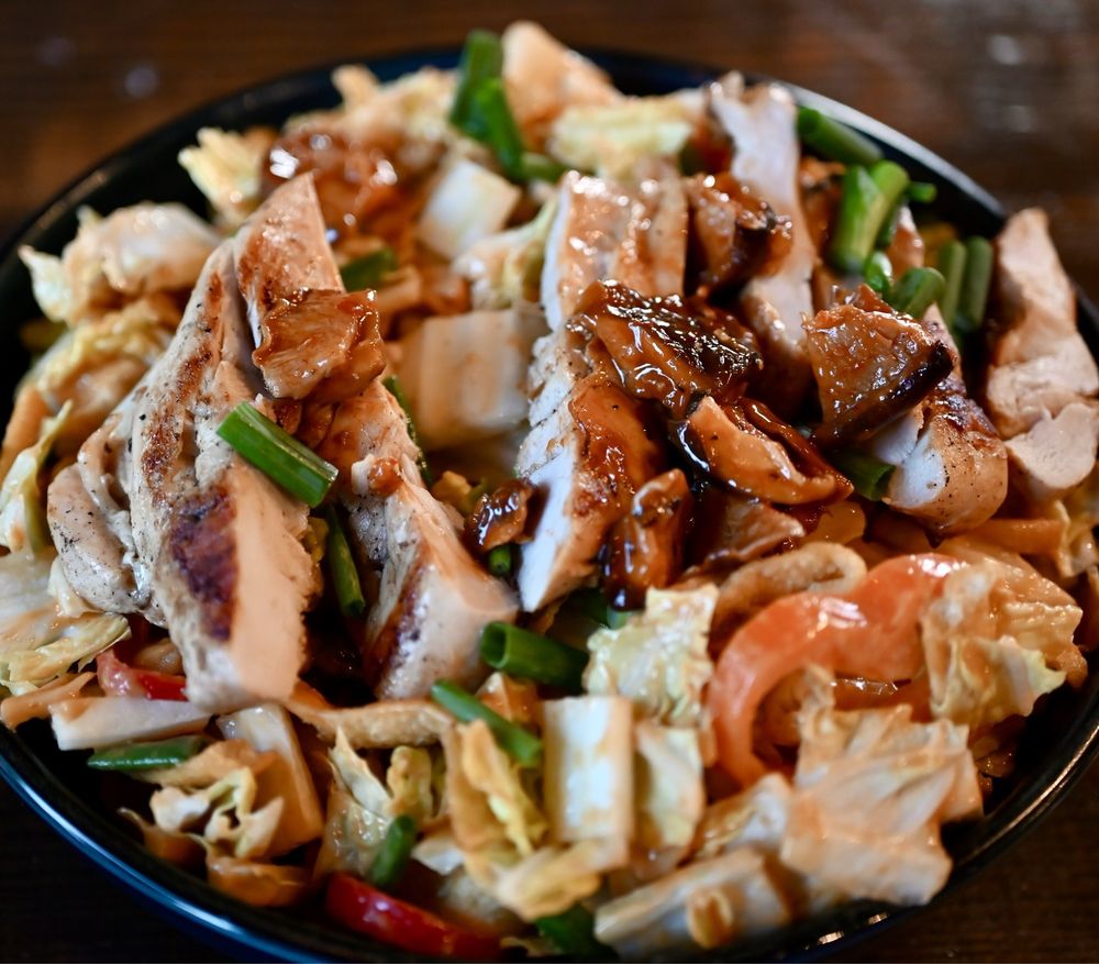 Grilled chicken breast, shaved napa cabbage, carrots, sweet pepper, green onion, shitake relish, Thai cashew dressing, crisp wontons.