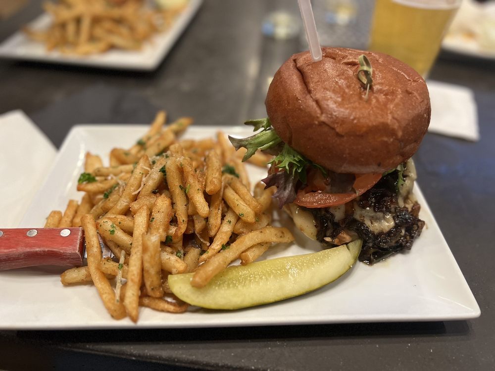 Beef brisket and short rib blended patty, seared Dragon Gourmet wild mushrooms, smoked gouda, garlic aioli, greens, tomato, red onion.