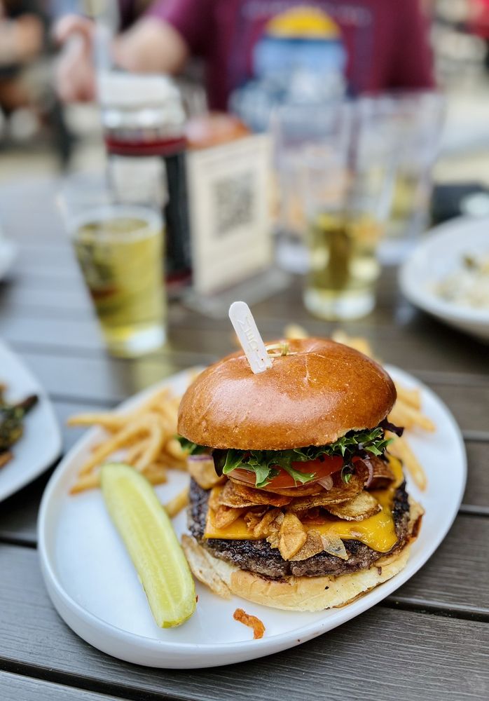 50/50 smoked bacon and beef patty, pepper jack cheese, jalapeno bacon jam, whiskey BBQ sauce, roasted garlic aioli, house pickled jalapenos.